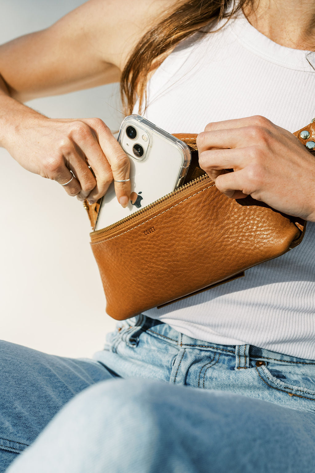 Designed as a chest pack that can double as a fanny pack & created with full grain leather; the finish is luscious and silky with a natural grain. Oils allow the leather to remain supple and soft from the start. A roomy interior that manages to stay slim and close to the body. Leather sourced from Italy.
