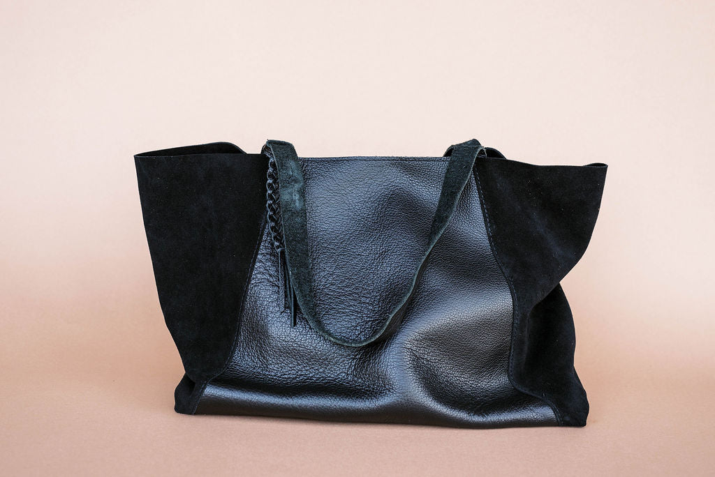 - Pebbled black cowhide panels and straps
