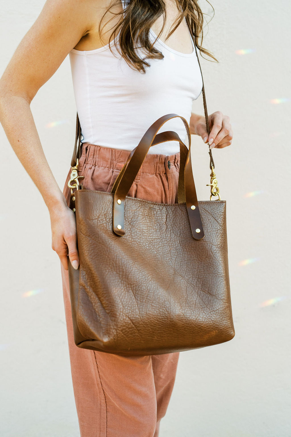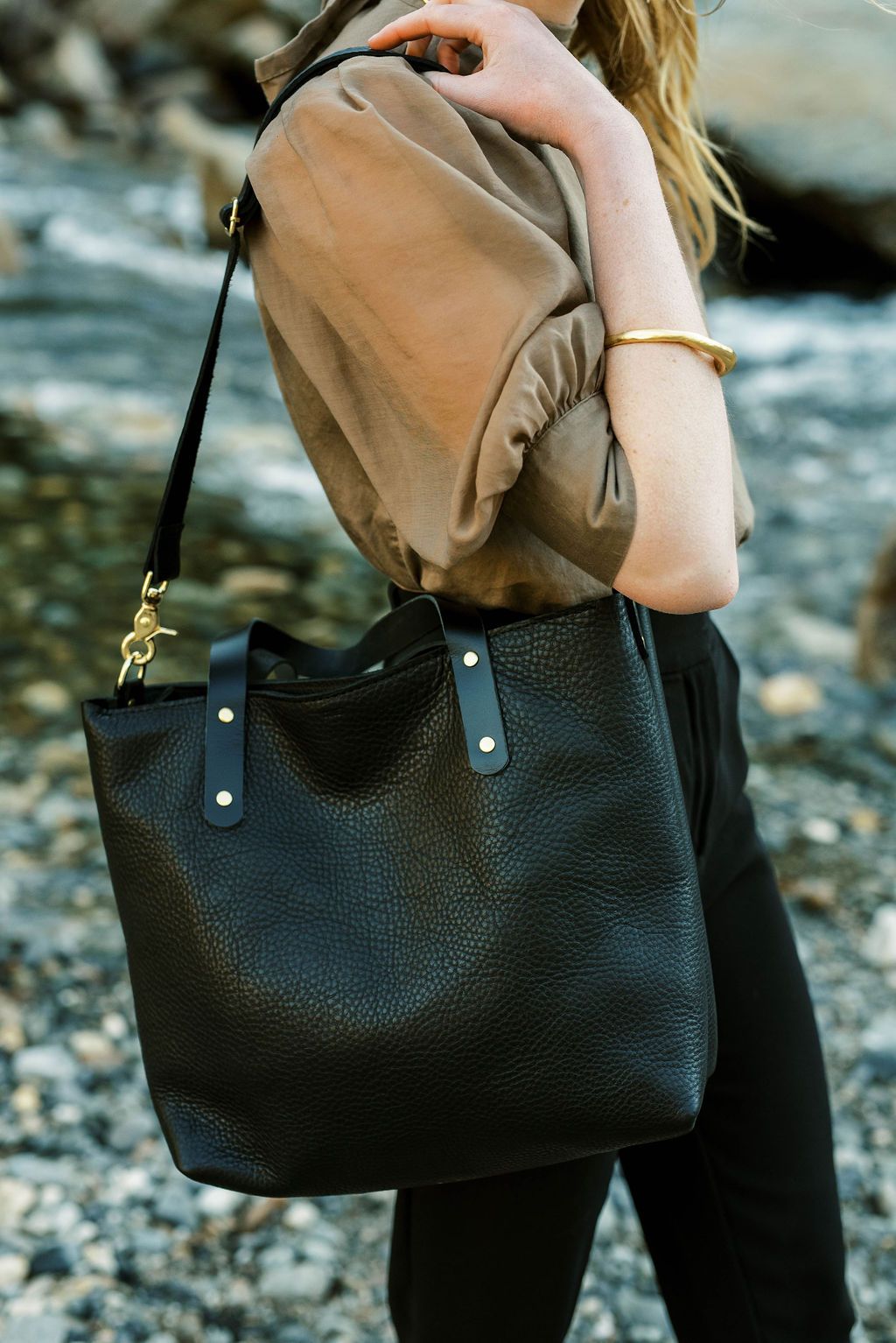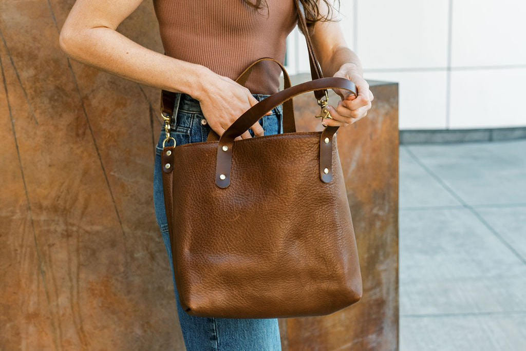 Luscious and silky with a natural grain; the oils allow the leather to remain supple and soft from the start. Tote handles made from a smooth pull-up leather which are kind to the hands.