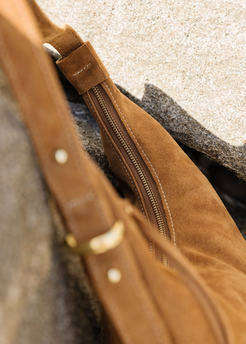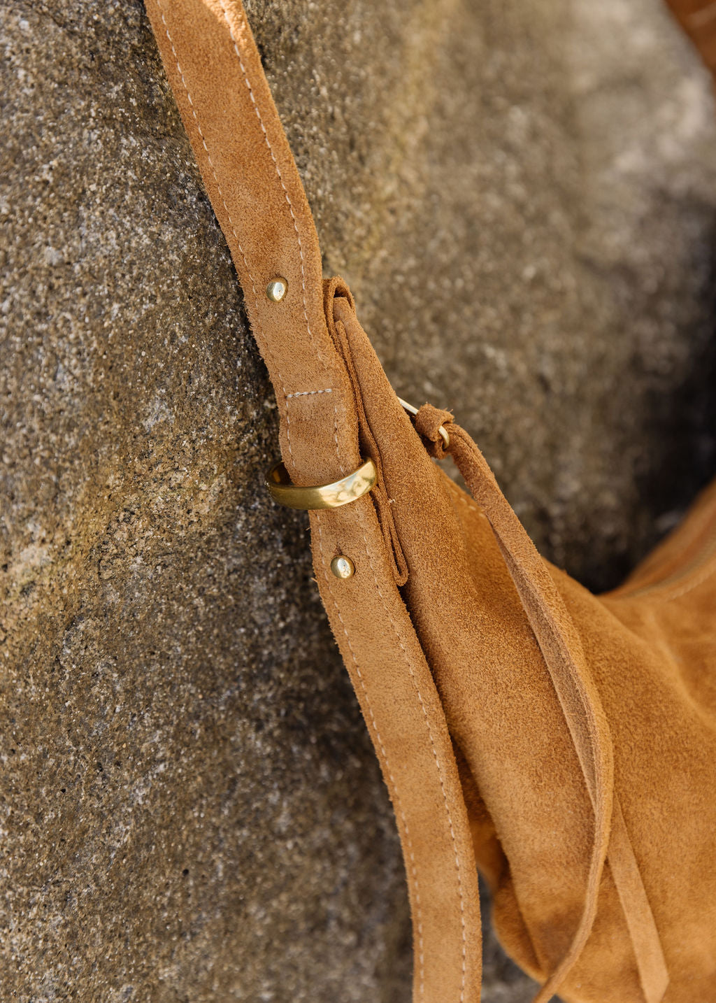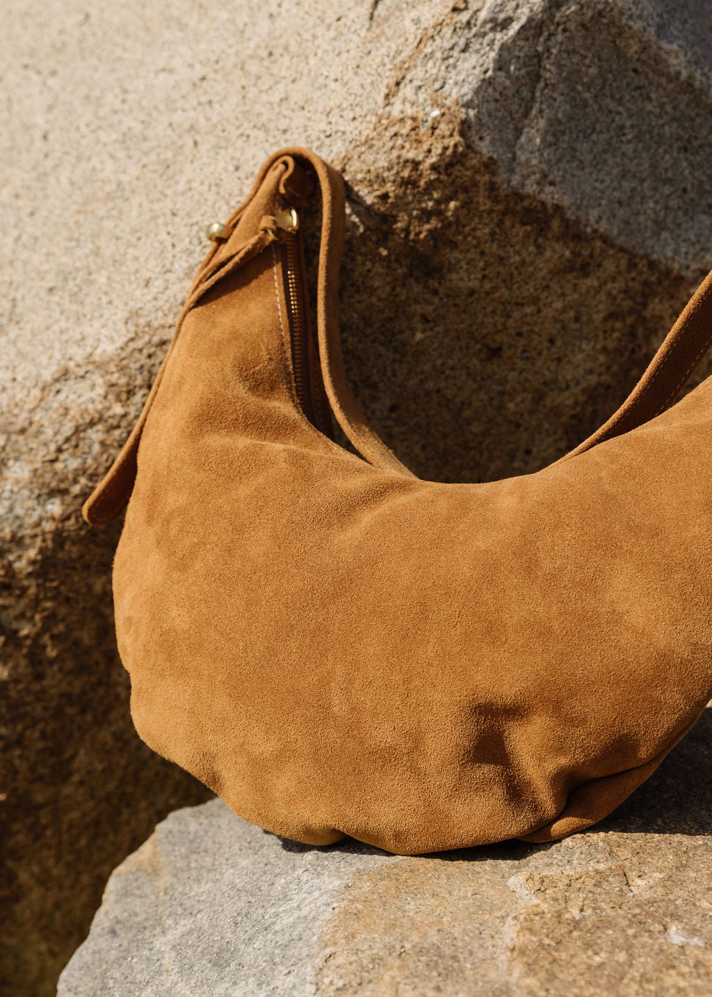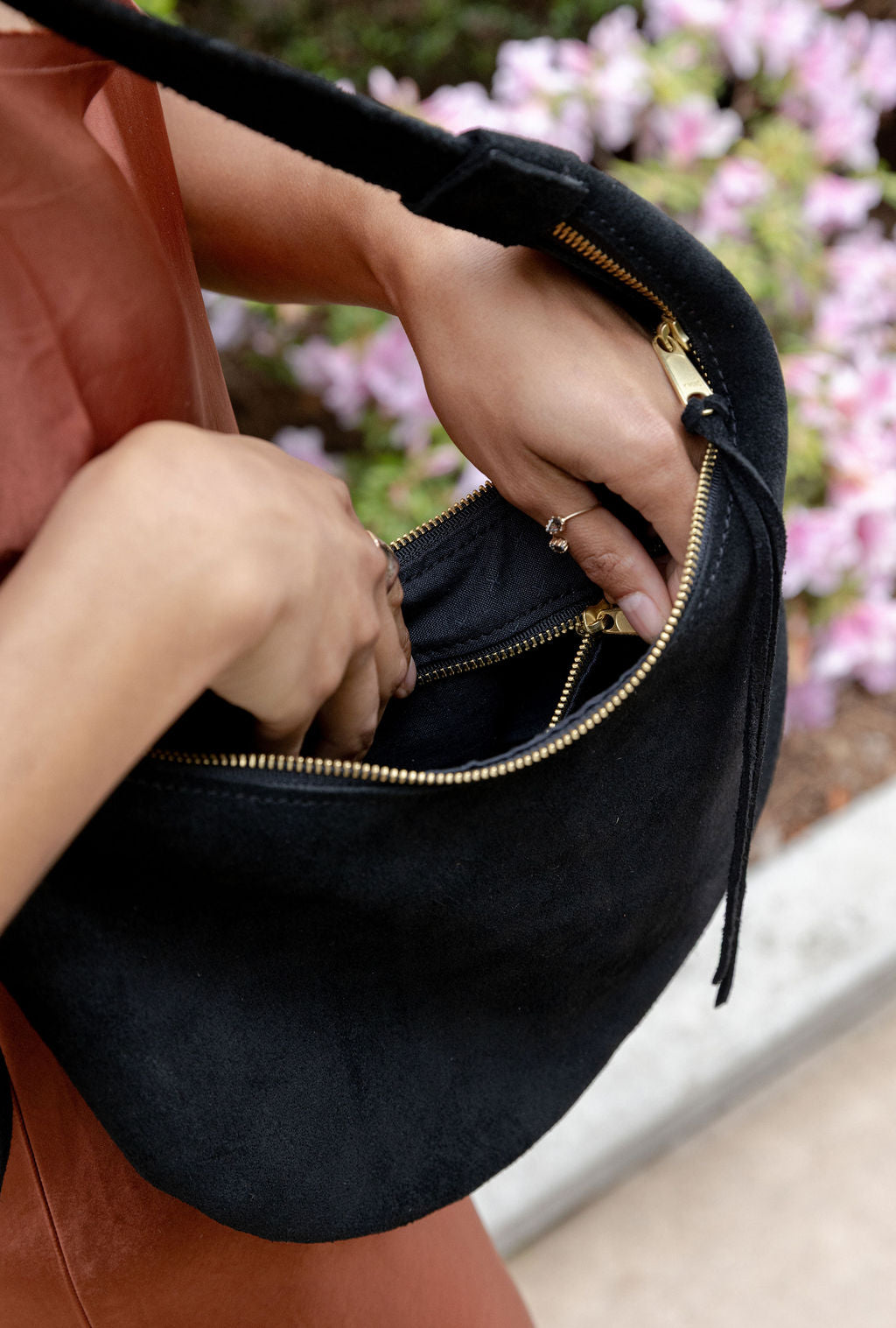 Softly structured in suede, Solis is an effortless take on the classic hobo. Slouchy, but balanced by thoughtful details - a zippered interior pocket for essentials and solid brass hardware for a subtle, polished finish. Understated yet sleek & made to move with ease.